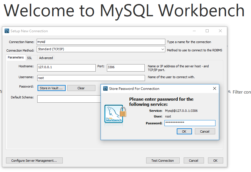 docker run --name mysql -p 3306:3306 -e MYSQL_ROOT_PASSWORD=password123 -d mysql接著直接用 tool 連接 MySQL 即可,可以用 workbench,