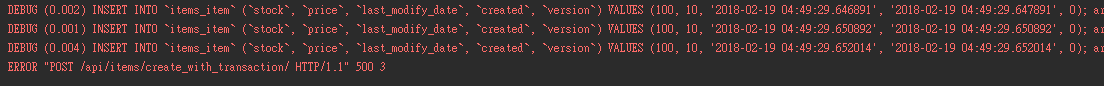 version = models.IntegerField(default=0)讓我們來看看 Atomicity 的例子,簡單說明一下,這邊我會模擬新增 5 筆資料,其中一筆資料異常,