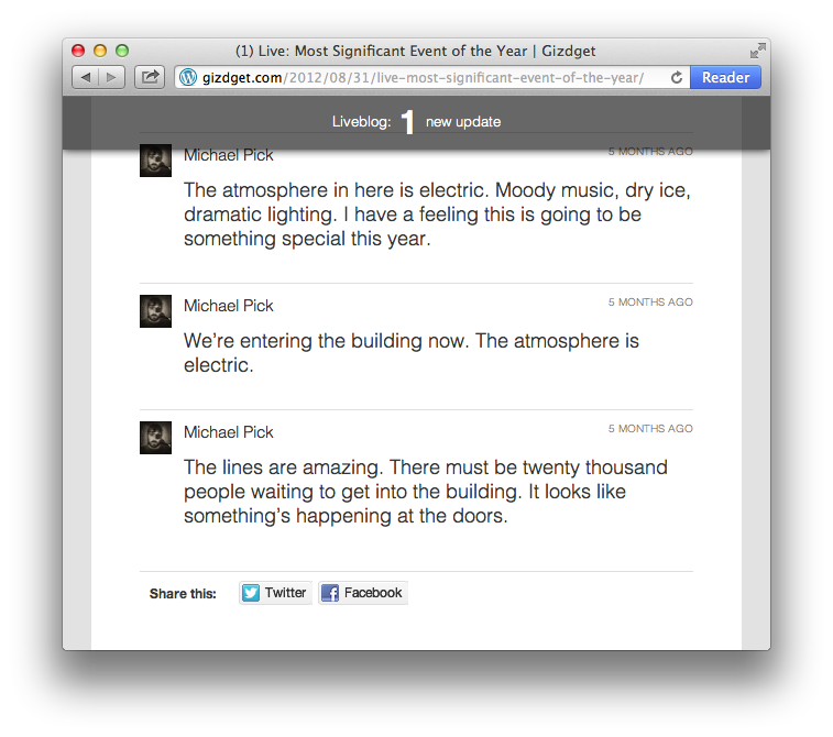 The liveblog uses smart updates, making it easy for your readers to enjoy your liveblog without being overwhelmed with updates. If the reader's browser is at the top of the post, new posts will automatically appear, highlighted in yellow.