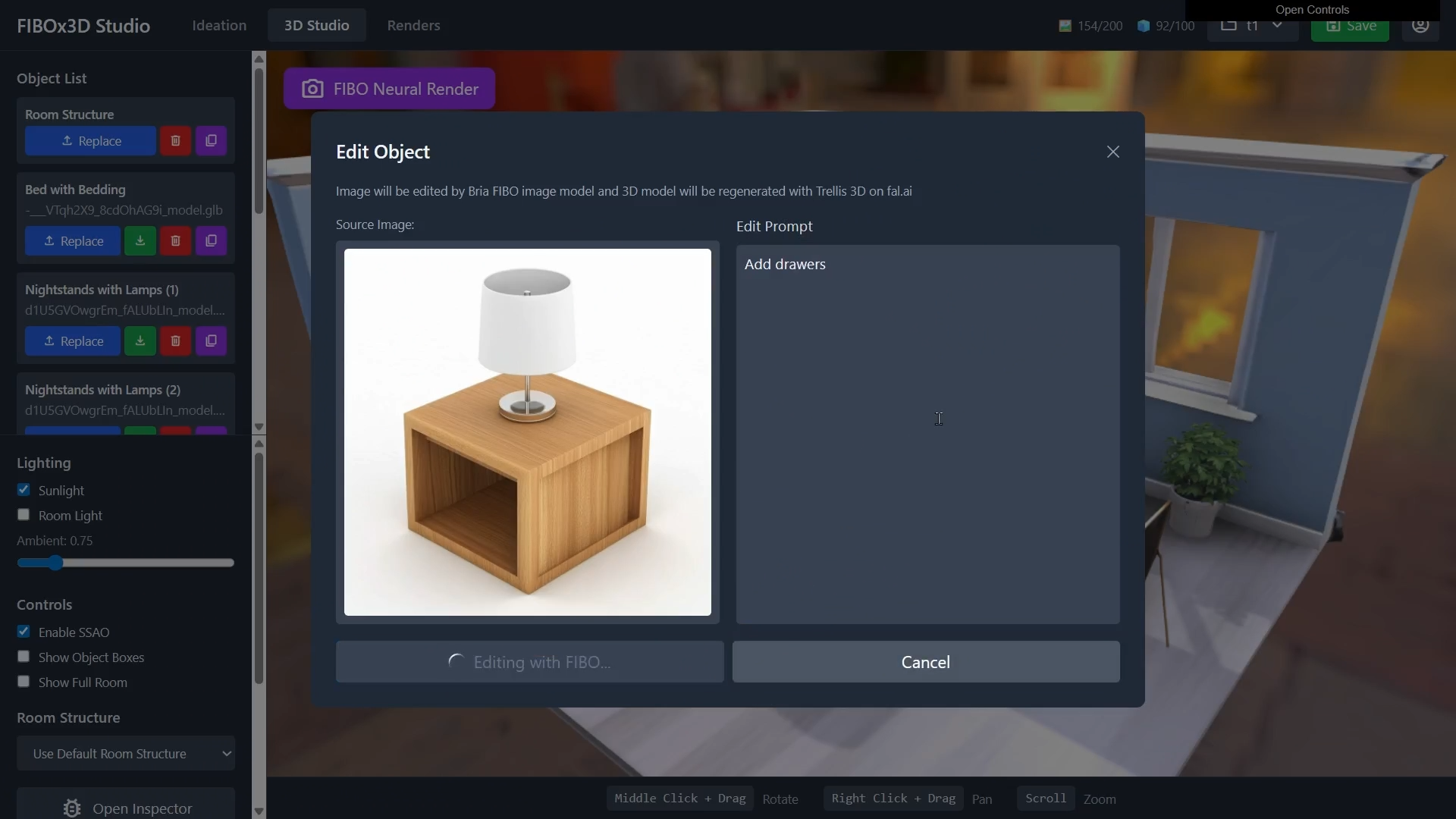 Use FIBO to edit 3D assets. Simply click on an object and tell FIBO how you want to change it. FIBO instantly creates a new mockup, which fal.ai's Trellis 3D generation can turn into a new model and swap into the scene for use.