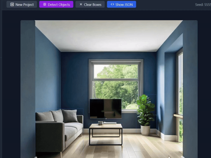 You can intuitively click on objects within the image to instruct FIBO to edit them. Thanks to FIBO’s disentangled generation, you can edit a single object (like changing a pillow color) without the "butterfly effect" ruining the rest of the room. This is a game-changer for consistency.