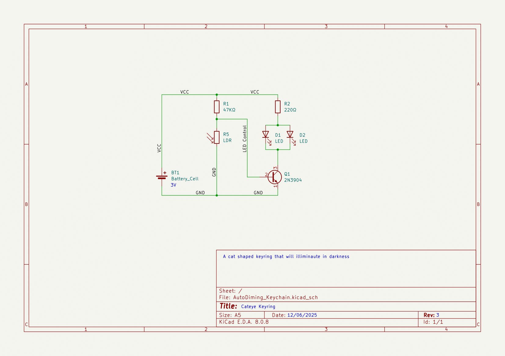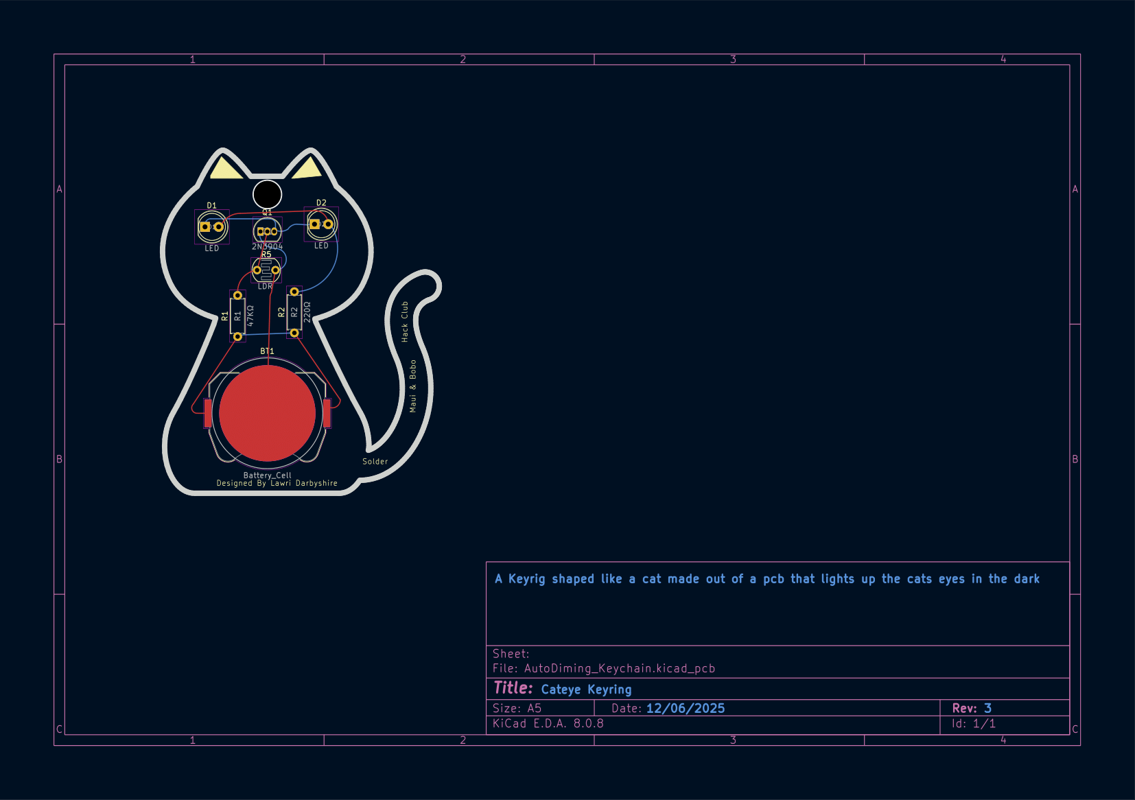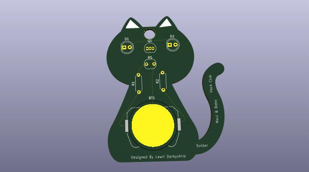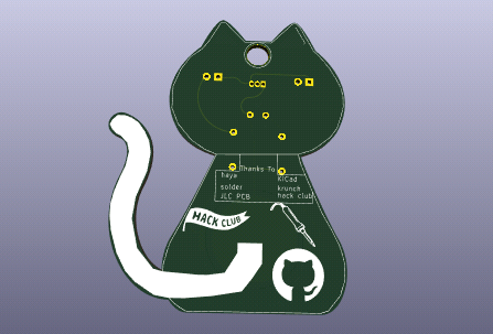 A PCB i made for an HackClub YSWS Called Solder. The PCB Will Automaticly Dim The LEDS when its Bright and Brighten them when its dark. It was made with KiCad 8. The PCB Mesurements are aprox 65mm x 50mm. The PCB has Passed DRC Ki Cad Check with only a via warning for the key hole at the top of the cat.