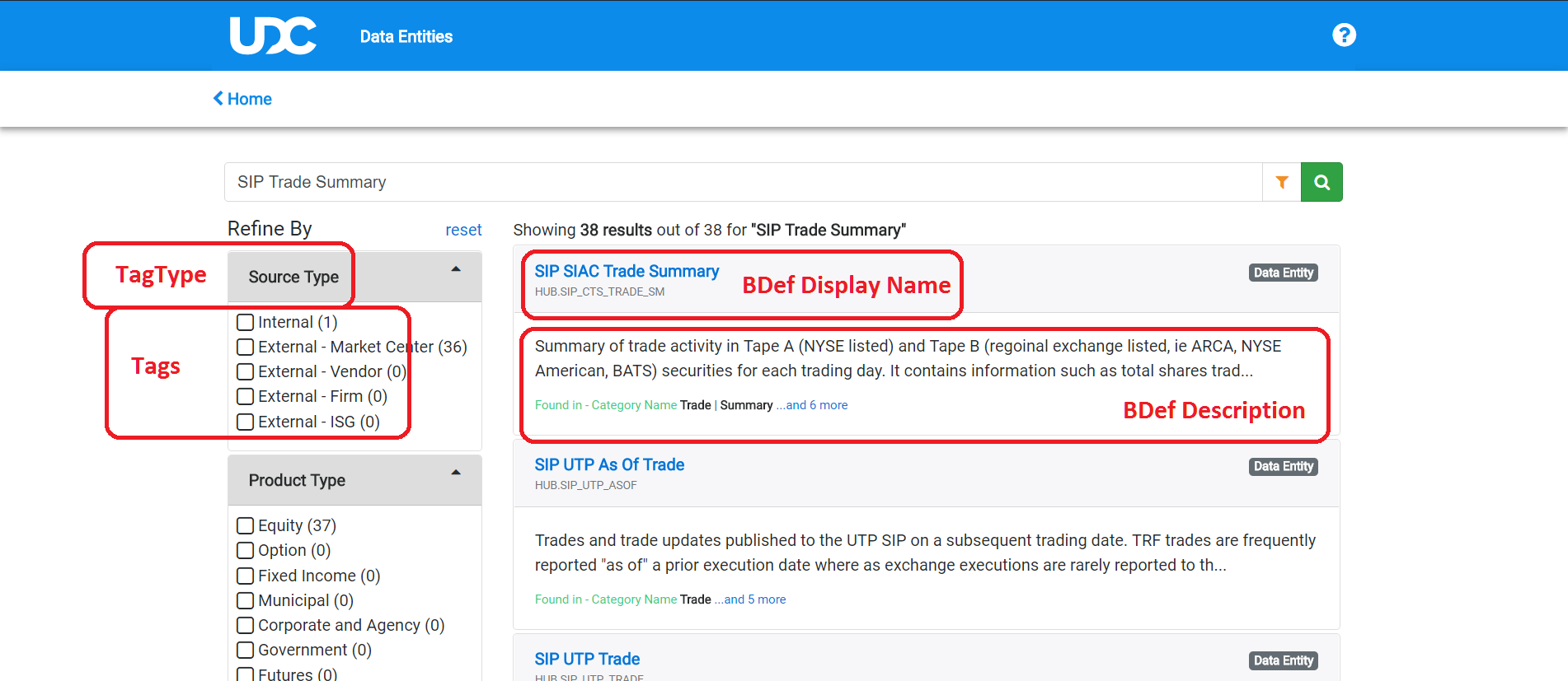 | BDef Tag Post/Get/Delete | Manages the association between a BDef and one or more Tags. TagTypes and Tags must be created (see Endpoints-Tags) prior to associating them with BDefs. | Tags associated with a BDef appear on the right-hand side of the Data Entity page, listed as 'Categories'. Tags also drive the Category browse structure ('Explore') on the Home page. Tags also appear in the faceted filtering section on the left-hand side of the Search Results page. |