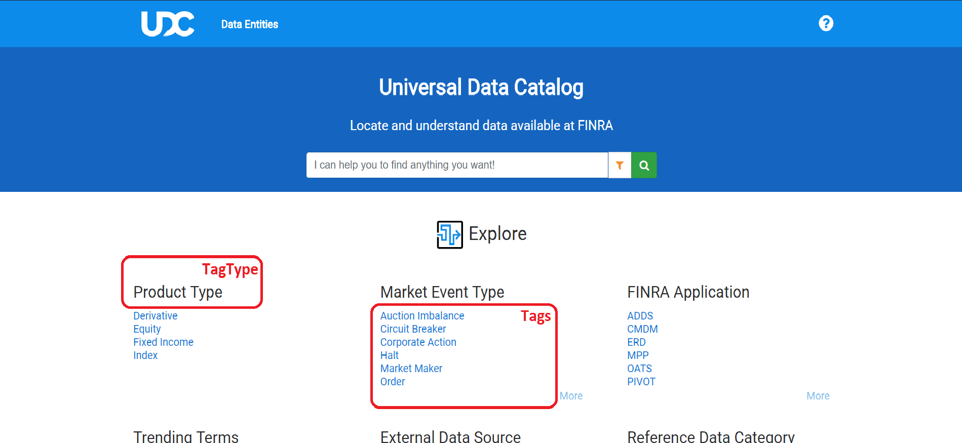 | TagType Post/Get/Put/Delete | Manage TagTypes which are used to group like tags together. | TagTypes appear as headers on the 'Explore' area of the Home page. TagTypes also appear as headers in the faceted filtering section on the left-hand side of the Search Results page. |