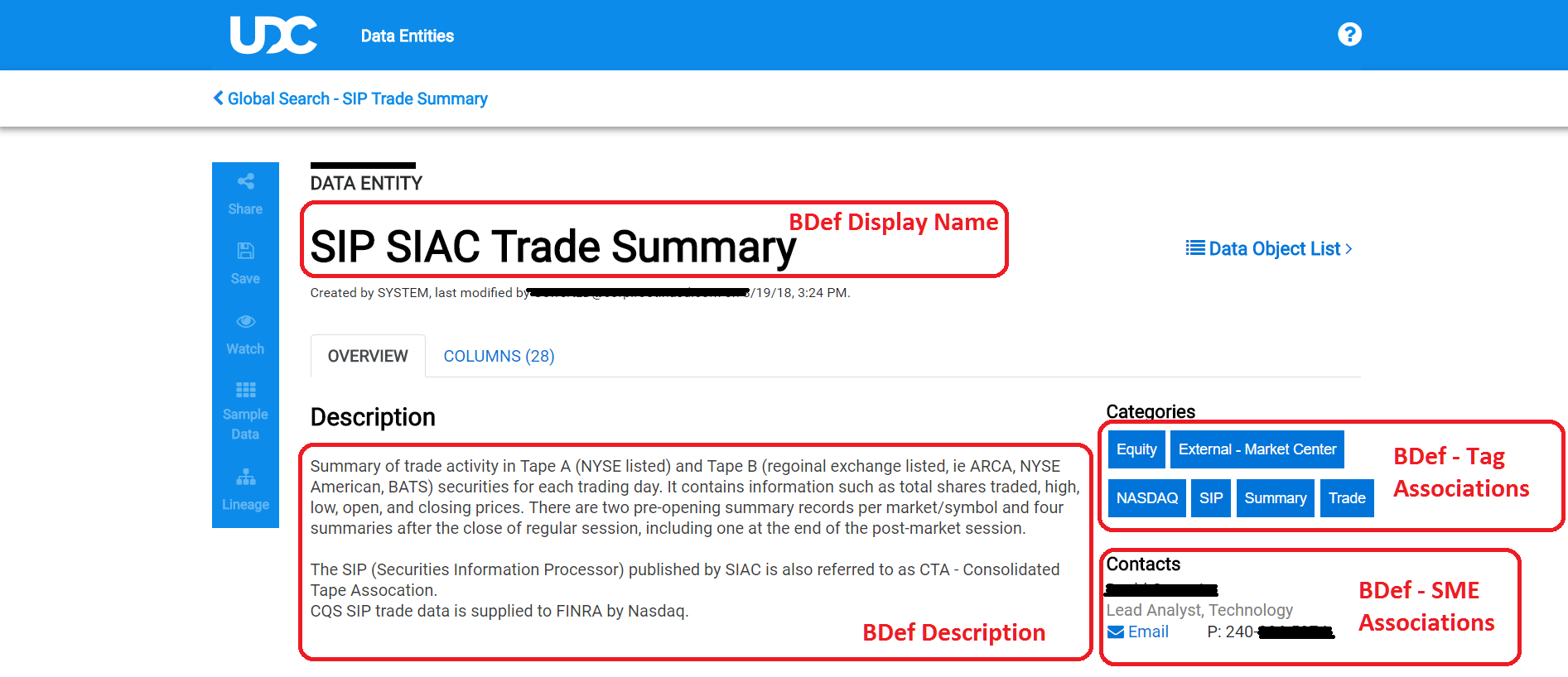 | BDef SME Post/Get/Delete | Manages references to SMEs (subject matter experts) on this BDef. The reference is stored in the form of a userId which is used to look the contact up at runtime. Multiple SMEs can be associated with a BDef. | Contact information for the expert appears on the hight-hand side of the Data Entity page |