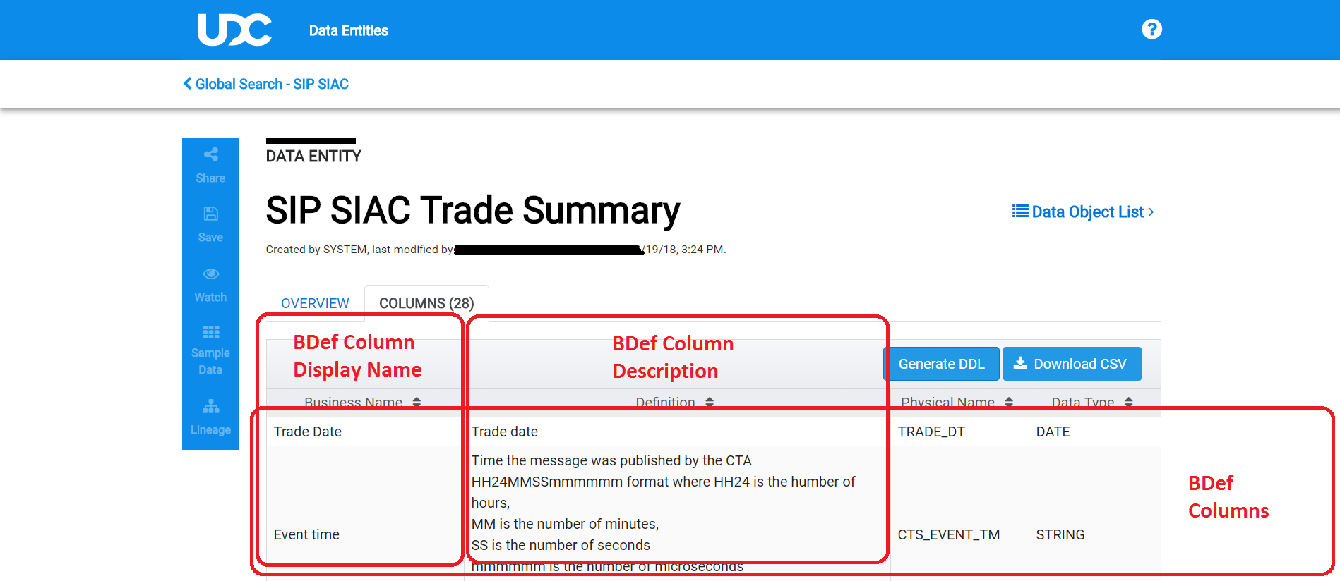 | BDef Column Post/Get/Put/Delete | Manages Column Display Name and Column Description for the Descriptive Format. BDefs initially do not have any BDef Columns. When adding BDef Columns, the schemaColumnName must match a Column Physical Name of a column in the Descriptive Format. | BDef Columns appear in the 'Columns' tab of the Data Entity page. Note that a BDef without any BDef Columns will only display technical metadata (right-most columns with Column Physical Name, Datatype). |