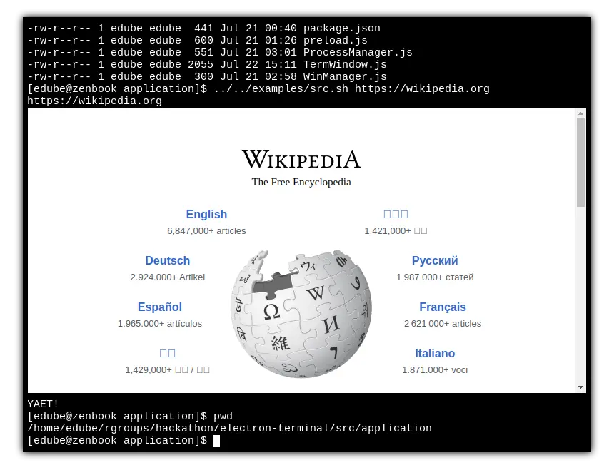 YAET is a terminal emulator built on Xterm.js and Electron. It can interpret escape sequences that allow shell scripts and other programs to write HTML content directly to the terminal, or display content from the web.