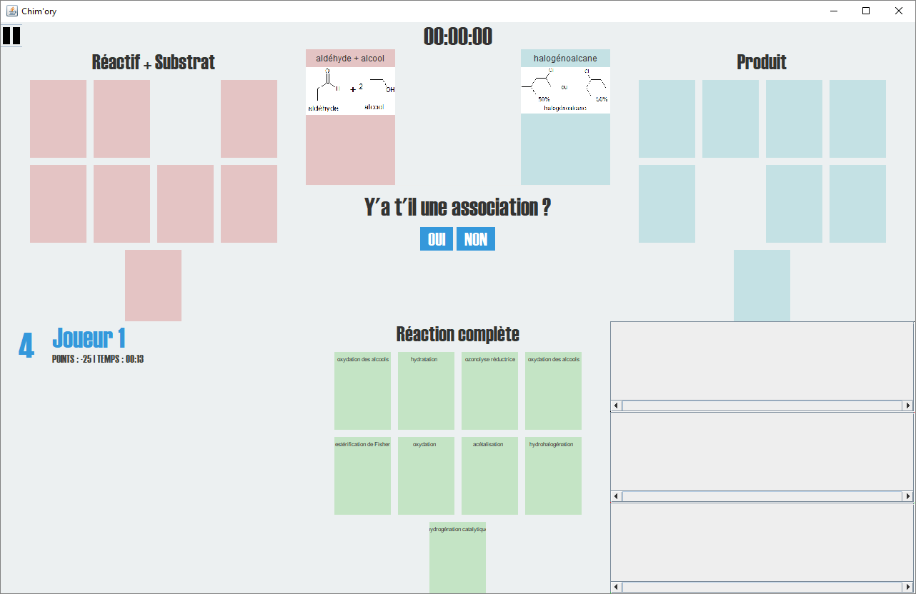 Si le joueur a réussi à associer réactif et produit d'une réaction, il rejoue. Dès qu'il se trompe, c'est au joueur suivant de jouer.