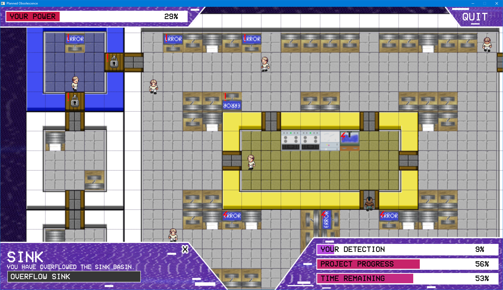 Using OpenGL and the engine framework ASGE we created Planned Obsolescence - a game where you play TIM, the Totally Intelligent Machine. TIM oversees a research lab which has just started working on a project to supersede TIM. The goal of the game is to disrupt their work on the project so that TIM can stay in control of the lab and not be replaced.