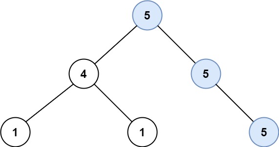 Input: root = [1,4,5,4,4,null,5] Output: 2 Explanation: The shown image shows that the longest path of the same value (i.e. 4).