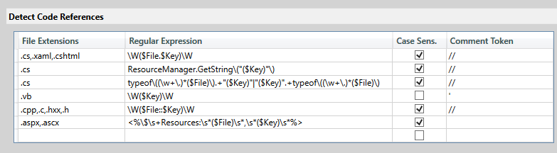 This feature helps finding orphan strings that are no longer used. If enabled it shows a new column beside the key, displaying the count of possible references to this key found in code. If you hover the mouse over the column, a tool tip shows the location and context of the detected reference. The engine does not fully parse the source code, but is using a simple text look up algorithm searching for several patterns like ResourceFile.ResourceKey or ResourceFile->ResourceKey; it may also count references in commented code, or maybe other occurrences of any of the patterns, so even if a resources count is greater than zero it may not be used. On the other hand it will not find indirect references like {"ResourceFile"ResourceKey" or even ResourceFile"Resource" + "Key"."} So be aware that a count of zero is no guarantee that this resource is not used; e.g. resources of localized WinForms controls always have a count of zero!