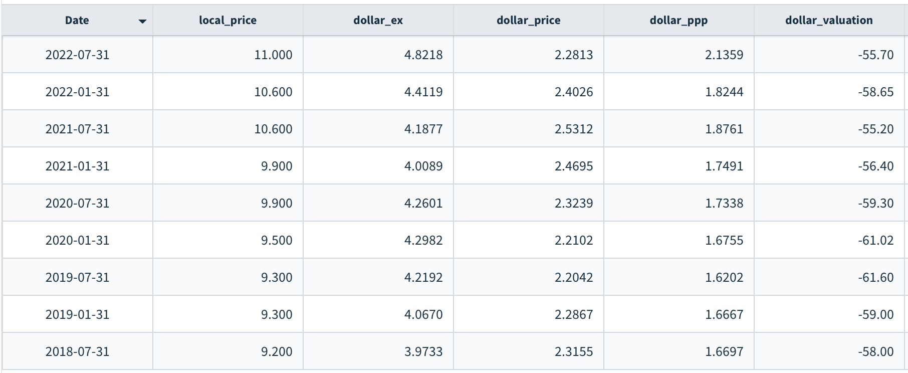 Example of Big Mac Index - Romania - https://data.nasdaq.com/data/ECONOMIST/BIGMAC_ROU-big-mac-index-romania