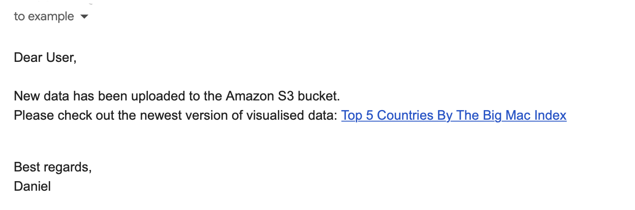 Next, the script sends email notification to the specified email address that the data was uploaded on S3 bucket.