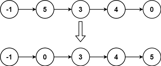 Input: head = [-1,5,3,4,0] Output: [-1,0,3,4,5]