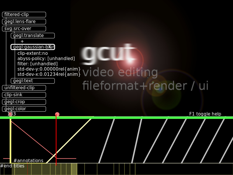 gcut is a video editing engine for GEGL. It permits reusing image filters written as GEGL operations to be reused for video, and basic motion graphics. And serves as an additional application and use case for verifying and improving GEGLs behavior for gcut as well as other GEGL using applications.