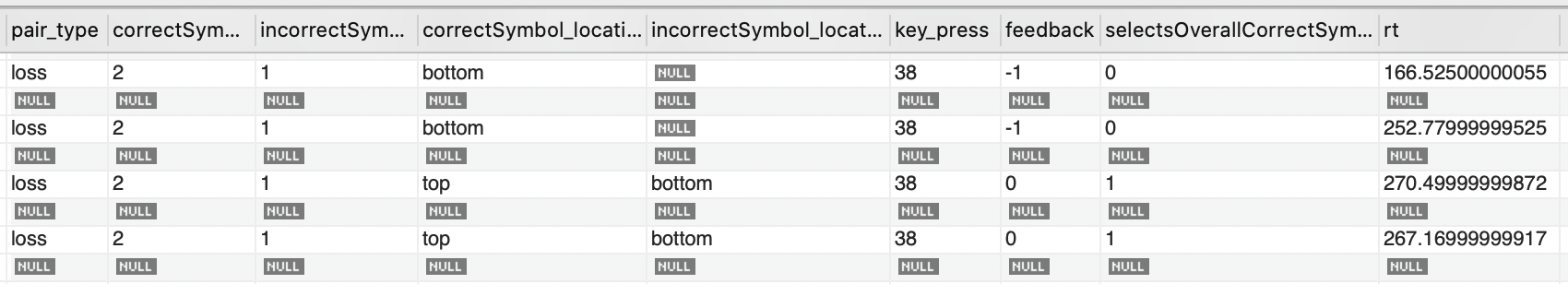 Hello everyone, In our experiment, there is one test trial and one feedback trial. I put them in a timeline like this: This is all good. But when it comes to saving to MySQL database, I see rows of feedback trials which are mostly “null”. This is normal because feedback is actually a trial and jspsych’s plugin defaults run its data-saving procedure. Please see the image attached here. Is there a common way to entirely stop a plugin trial from saving to the database? Something like a mute? 1- I tried to merge the feedback trial into the test-trial. I can edit the plugin by changing the This is how I do normally access trial parameters to be used used for feedback response. .. 2- Another way to do that would be doing it after on_finish: I also tried removing trial_data from the Any help in finding a direction is much appreciated! Gorkem |