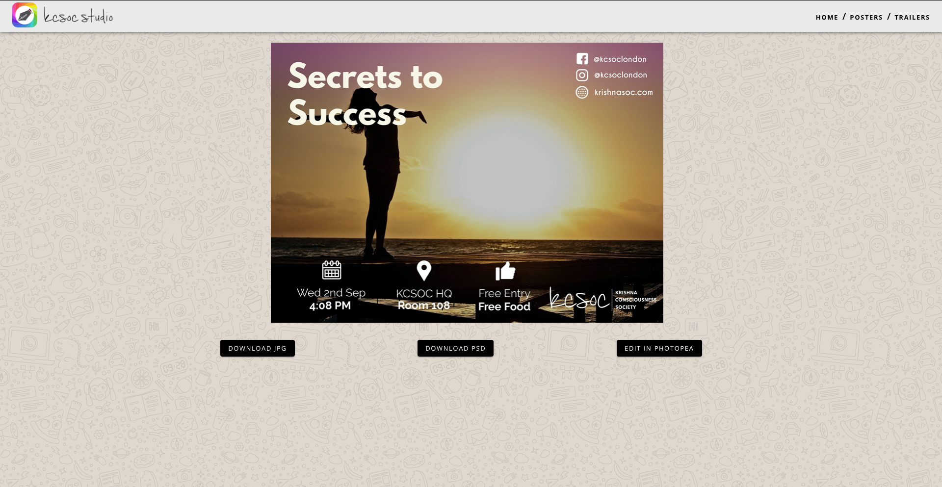 This revolutionary tool will help you make professional, high-quality posters and trailers for your local KCSOC without you needing to have any photo/video editing skills whatsover! New features are planned to be added soon. Feel free to report any bugs/issues or create pull requests.
