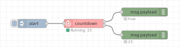 msgat the countdown start/stop instant of time. Thesemsg.payloadcontents are configurable. If Option "Send Outputmessage on Reset" ist set, the message is send, when the timer is stopped. Otherwise, the Stop message will only by send, if the timer reaches zero. - The secondary output (lower output) emits the remaining time every second during the timer runs. The