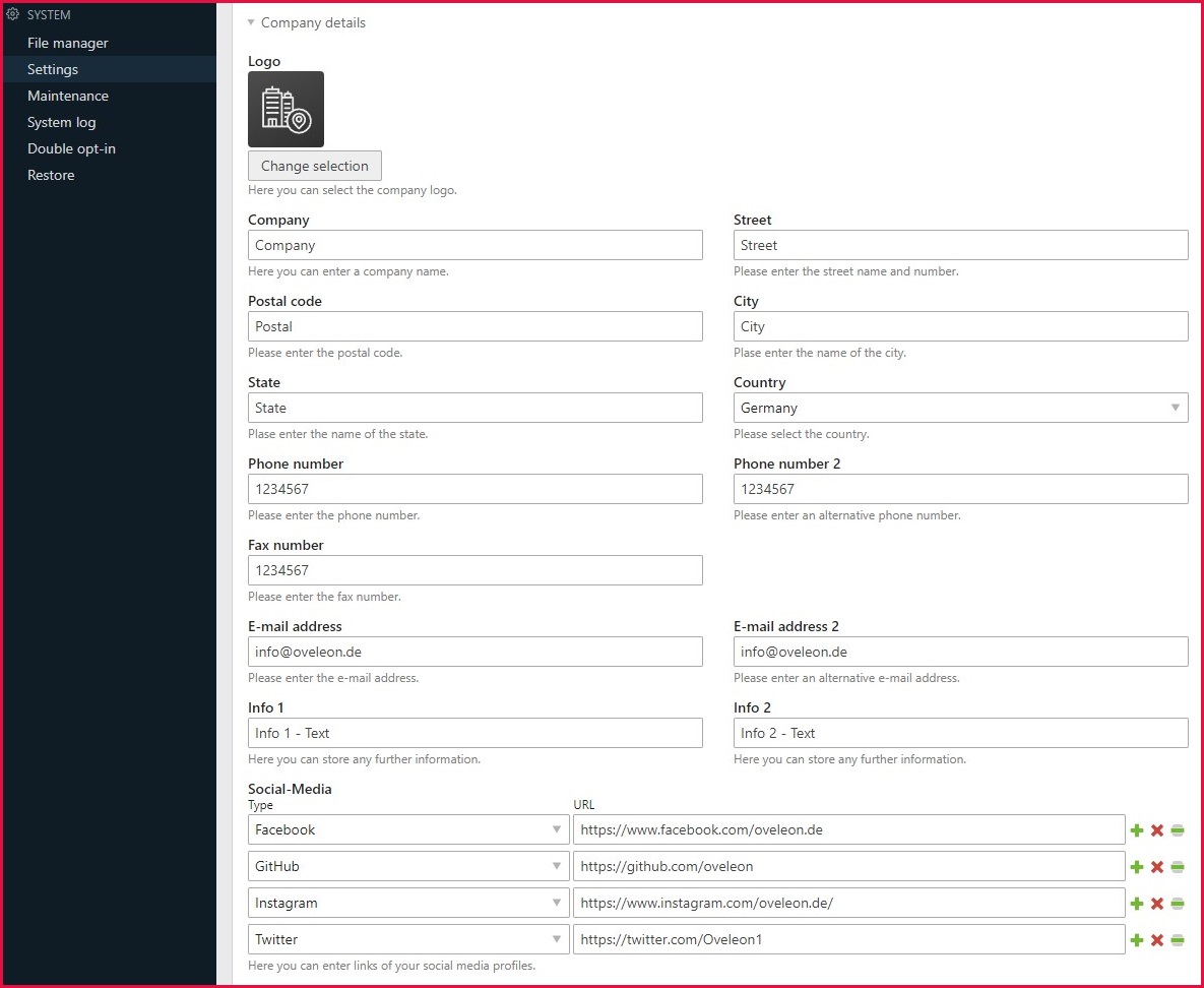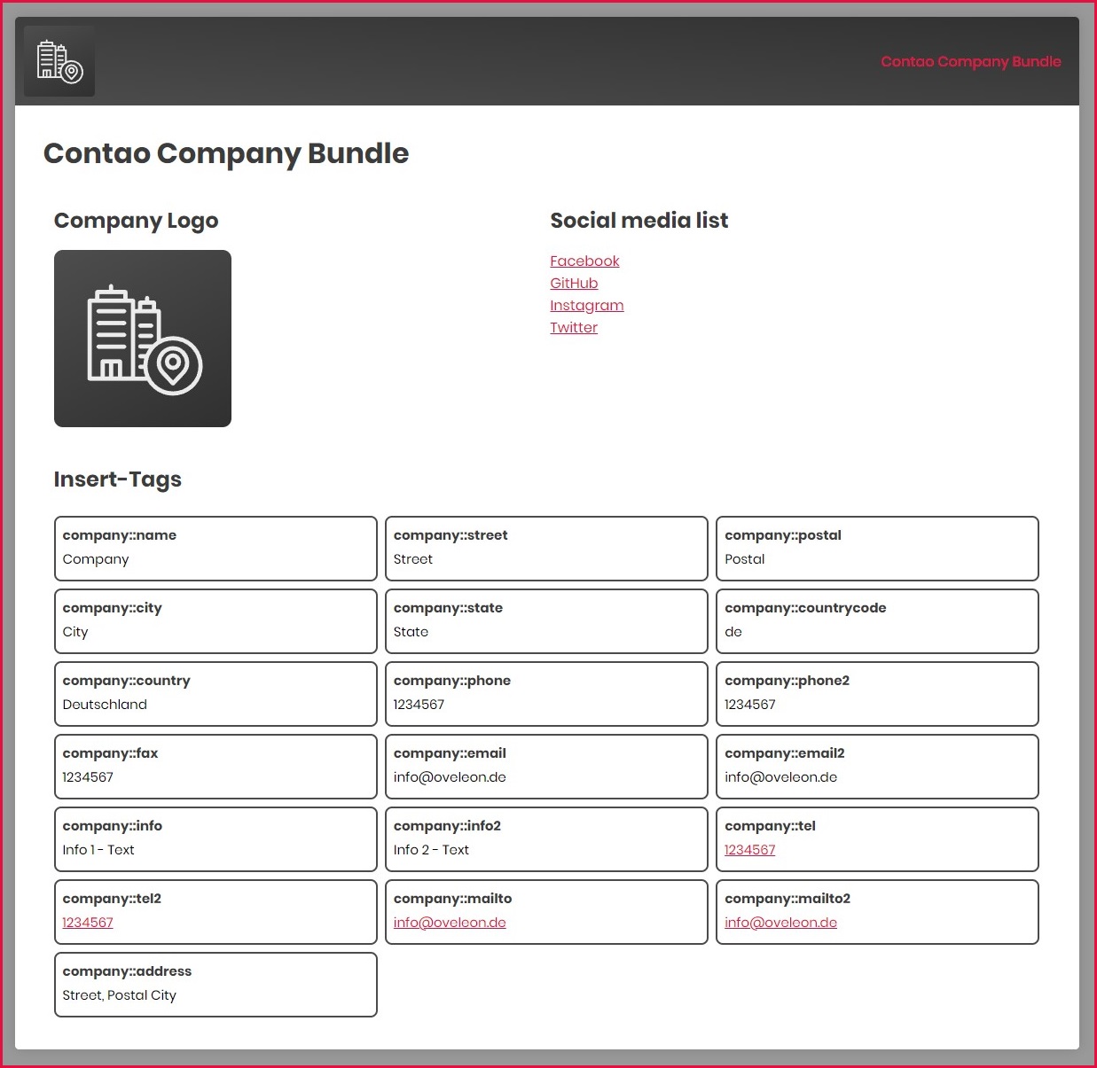 The Company Bundle adds company information via Insert-Tags, social media information and a logo module for websites and different website roots.