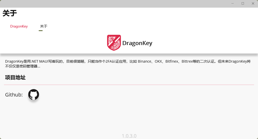 DragonKey DragonKey是什么? DragonKey是用.NET MAUI写的跨平台应用,已适配Android和windows端,均支持黑暗模式。是一个自托管2FA认证应用,比如代替Google身份验证器给GitHub、X、meta、Binance、OKX等的二次认证。但未来DragonKey将不仅仅是密码管理器... 运行截图 android Windows 下载链接 进qq群下载:273145623 也可以自己在GitHub下载:DragonKey 🥰如果喜欢你也可以请我喝果汁🥰 打赏 / Donate 推广 进入web3领取最高1万元数字礼包