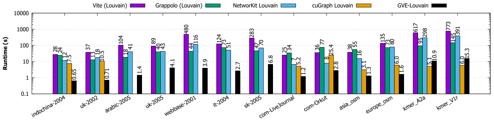Below we plot the time taken by Vite (Louvain), Grappolo (Louvain), NetworKit Louvain, cuGraph Louvain, and GVE-Louvain on 13 different graphs. GVE-Louvain surpasses Vite, Grappolo, NetworKit Louvain, and cuGraph Louvain by 50×, 22×, 20×, and 5.8x respectively, achieving a processing rate of 560𝑀 edges/s on a 3.8𝐵 edge graph.