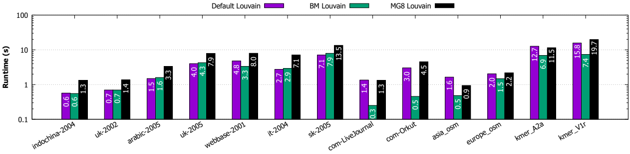 Below we plot the time taken by Default Louvain, weighted Boyer-Moore (BM) based Louvain, and weighted Misra-Gries (MG) based Louvain with k=8 slots, on 13 different graphs. MG8 Louvain is, on average, 1.48x slower than Default Louvain, but requires significantly less memory (i.e., just 64 bytes per thread).