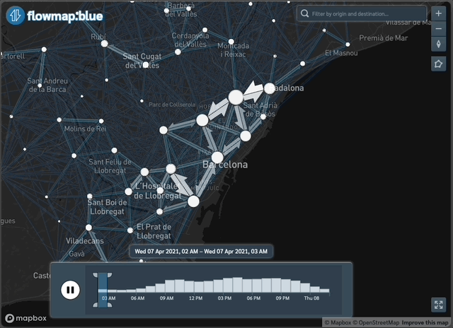 Figure 3: Example of the data available through the package: interactive daily flows in Barcelona with time filter
