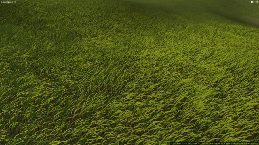 This is a followup to a previous experiment to render grass as geometry with a vertex shader. This demo adds terrain elevation, improved lighting, grass animation, wind, water and other details.