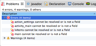 Getting this error could also mean your Android project compilation is likely corrupted in some way. Typically this error will occur on projects in particular cases such as generating a new icon or adding a new xml file. If you see this error in your "Problems" window after a clean, try closing and reopening Eclipse first, then try doing a Project => Clean.