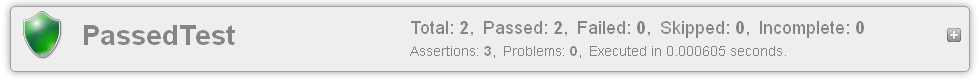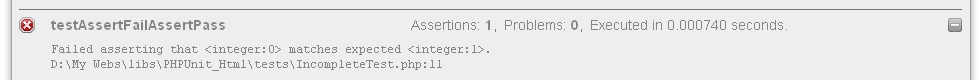 PHPUnit_Html will display any the number of assertions and problems generated by each test, along with the total execution time.